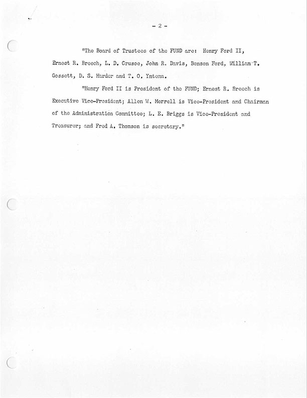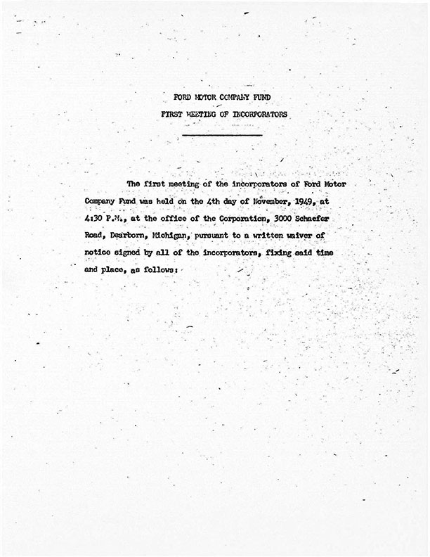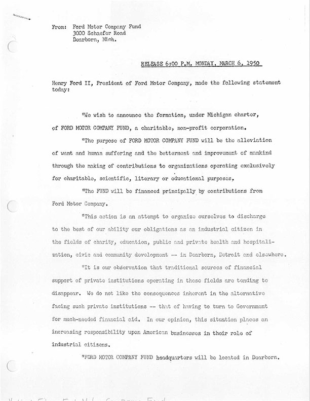 In September 1949, Henry Ford II established Ford Motor Company Fund – now Ford Philanthropy – as a corporate foundation dedicated to uplifting communities. In the aftermath of World War II and in the face of the growing Cold War, Henry Ford II observed a troubling trend: traditional sources of financial support for nonprofits were starting to fade. Building on the legacy of his father (Edsel Ford) and grandfather (Henry Ford), he created Ford Motor Company Fund to help fill the void.
