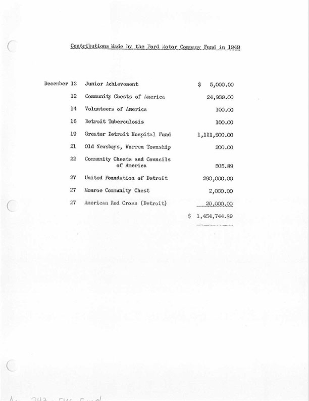 In the early years, Ford Philanthropy helped build hospitals, supported human services organizations and Community Chests across the country, provided educational scholarships, laid the financial foundation for the University of Michigan-Dearborn and played an important role in developing Downtown Detroit's Civic Center.